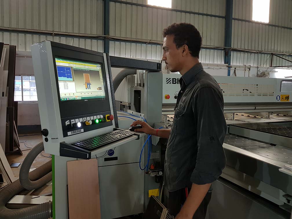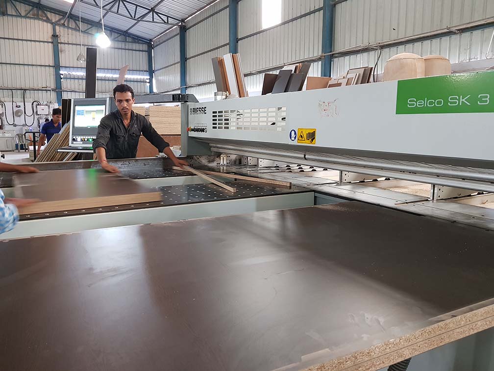 Wet paint Booth – Complete pressure and dust controlled water curtain based paint booth is used to spray polish / paint on the furniture component. The process involved multiple layered coating processes. The dust free environment ensures a smooth finish to the surface of the furniture item.